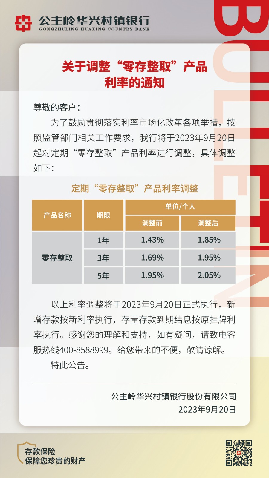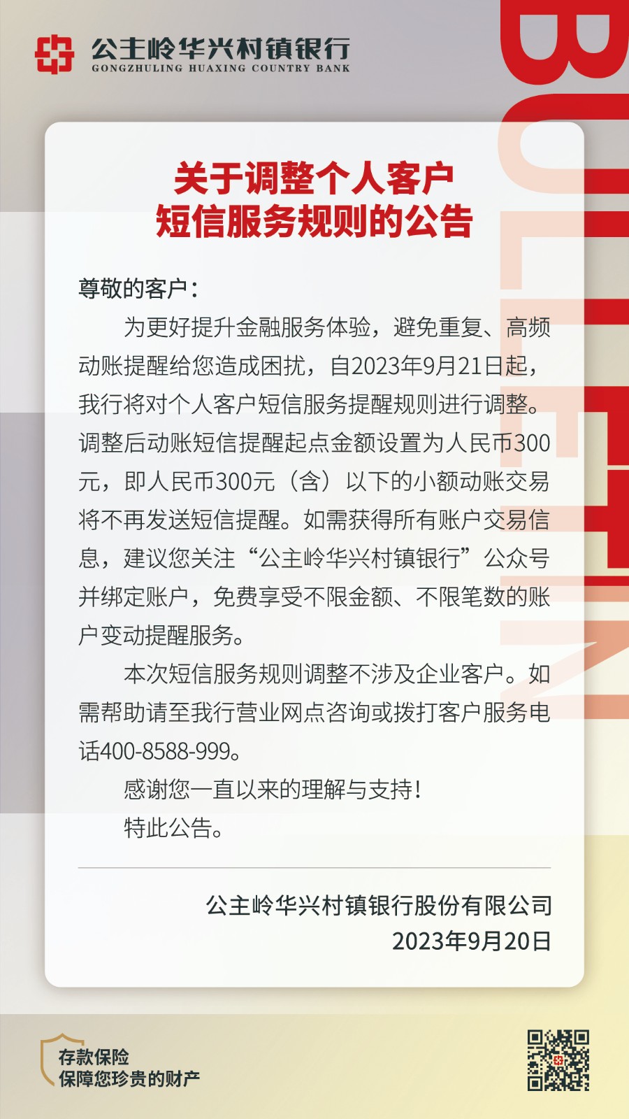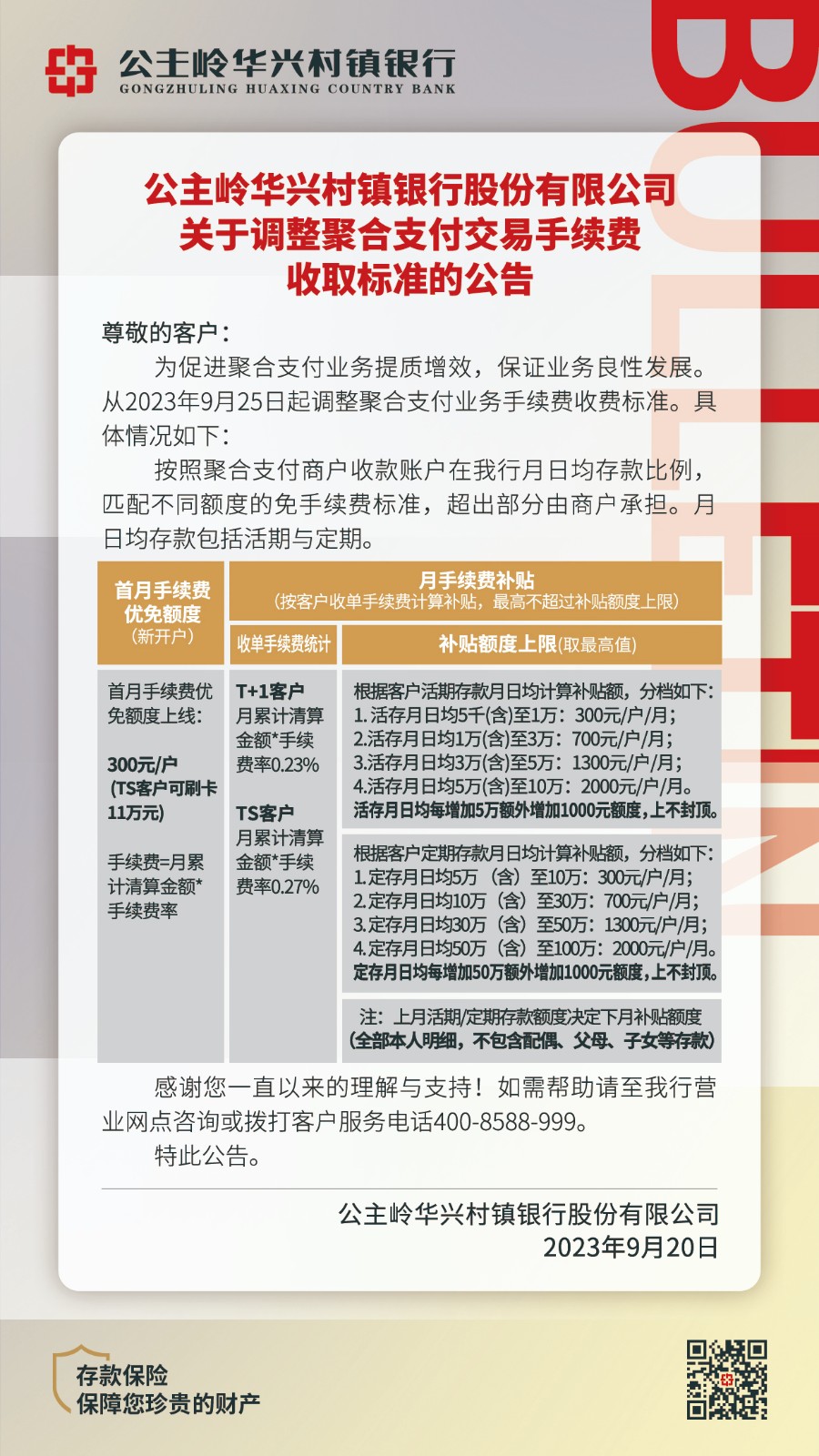 公主嶺華興村鎮(zhèn)銀行股份有限公司關(guān)于調(diào)整個人短信服務(wù)規(guī)則、“零存整取”產(chǎn)品利率、聚合支付交易手續(xù)費收取標準的公告